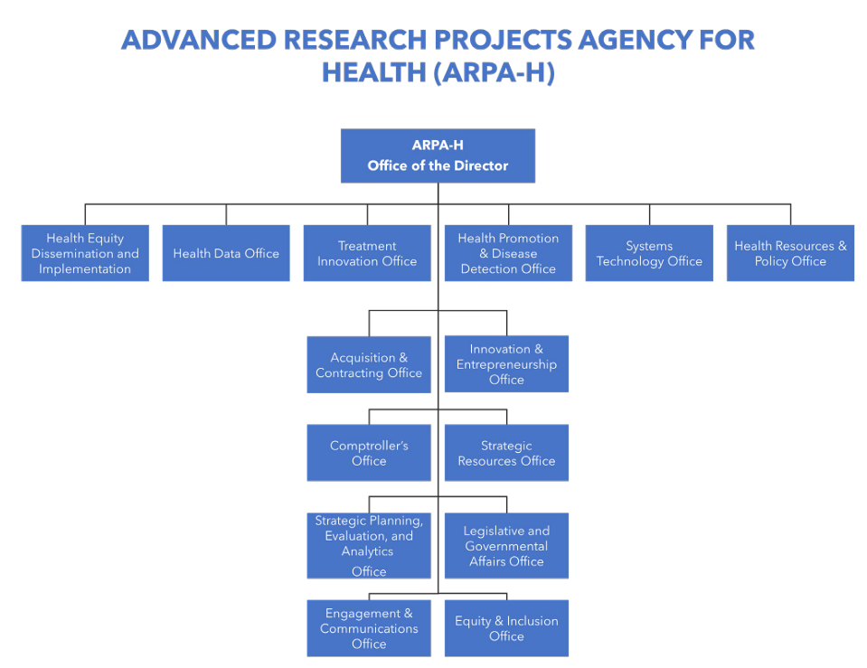 ARPA-H is led by a Director, appointed by the Secretary of HHS. ARPA-H manages R&D in its focus areas—health science futures, scalable solutions, proactive health, and resilient systems—through six mission offices, including a Health Data Office and a Systems Technology Office. ARPA-H’s other offices fill administrative, communications, and other support functions for the agency.