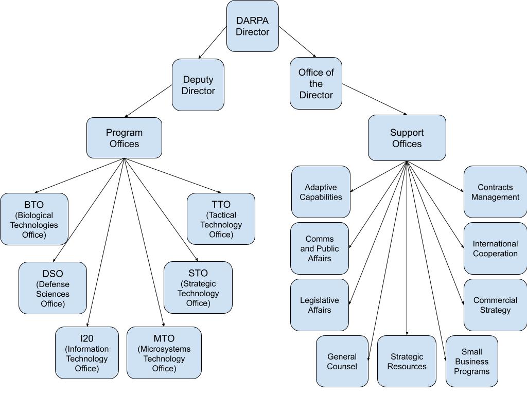 DARPA is led by a Director, appointed by DOD leadership (often in close coordination with the White House). At any time, DARPA oversees ~250 R&D programs spread across six program offices with technical focuses: