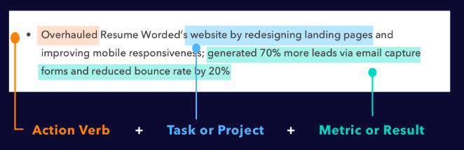 Write sentence fragments using this format: Action + Task + Result. For example: